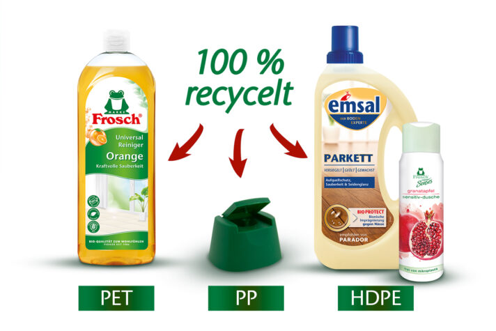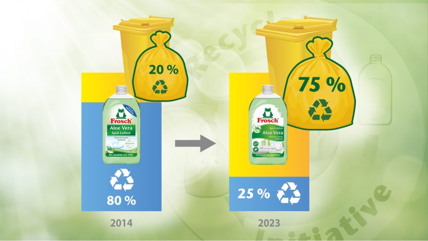Beim Recycling von Kunststoffverpackungen setzt Werner & Mertz seit Jahren immer wieder neue Maßstäbe. Schon seit 2014 bestehen die PET-Flaschen von Frosch komplett aus Recyclingmaterial. Zunächst stammten 20 Prozent davon aus dem Gelben Sack, die restlichen 80 Prozent aus der europäischen Getränkeflaschensammlung (Bottle to Bottle). 2021 erhöhte Werner & Mertz gemeinsam mit ALPLA den Altplastik-Anteil aus dem Gelben Sack auf 50 Prozent. Und 2023 folgte schon der nächsten Meilenstein: Die Steigerung auf 75 Prozent. Eine neue Bestmarke im internationalen Vergleich.